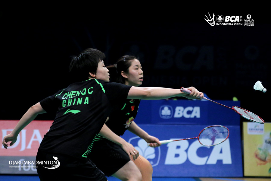 Chen Qingchen/Jia Yifan (Tiongkok) bersiap menghadang serangan