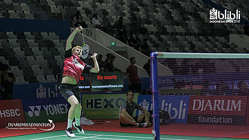 Christinna Pedersen (Denmark) melakukan pemanasan