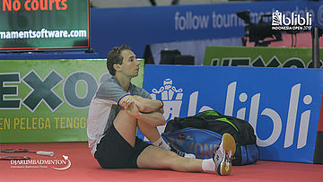 Mohammad AHSAN (Indonesia) melakukan pemanasan