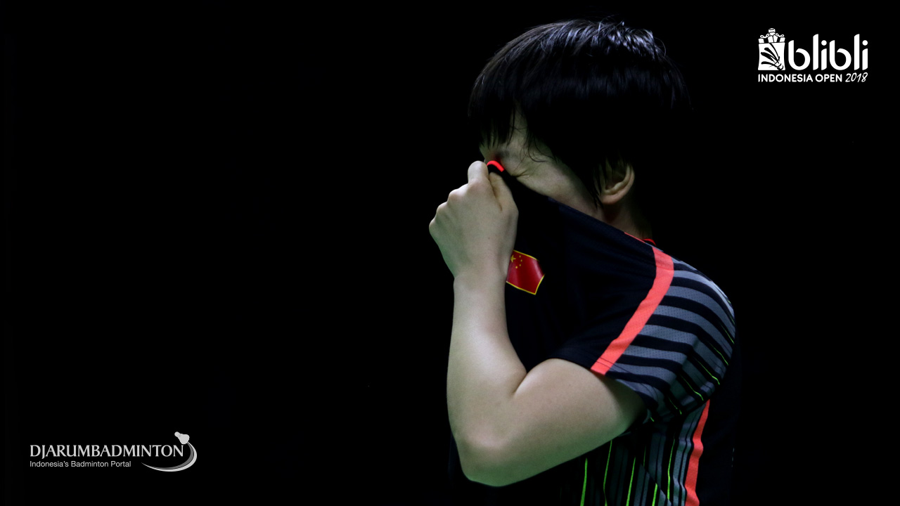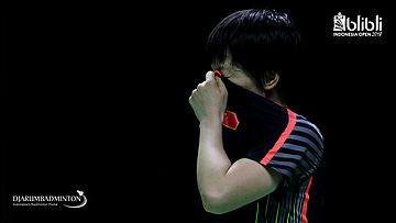 Jia Yifan (CHN) memberikan isyarat strategi sebelum melakukan serve