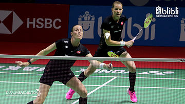 Kamilla Rytter Juhl/Christinna Pedersen (DEN) mengembalikan shuttlecock