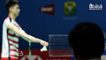 Salah satu hakim servis dengan teliti memperhatikan serve yang akan dilakukan Kevin Sanjaya Sukamuljo (INA)