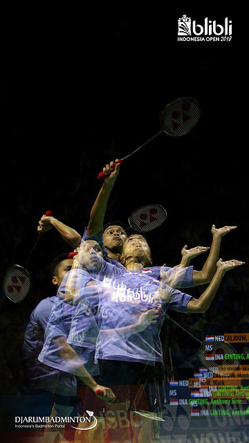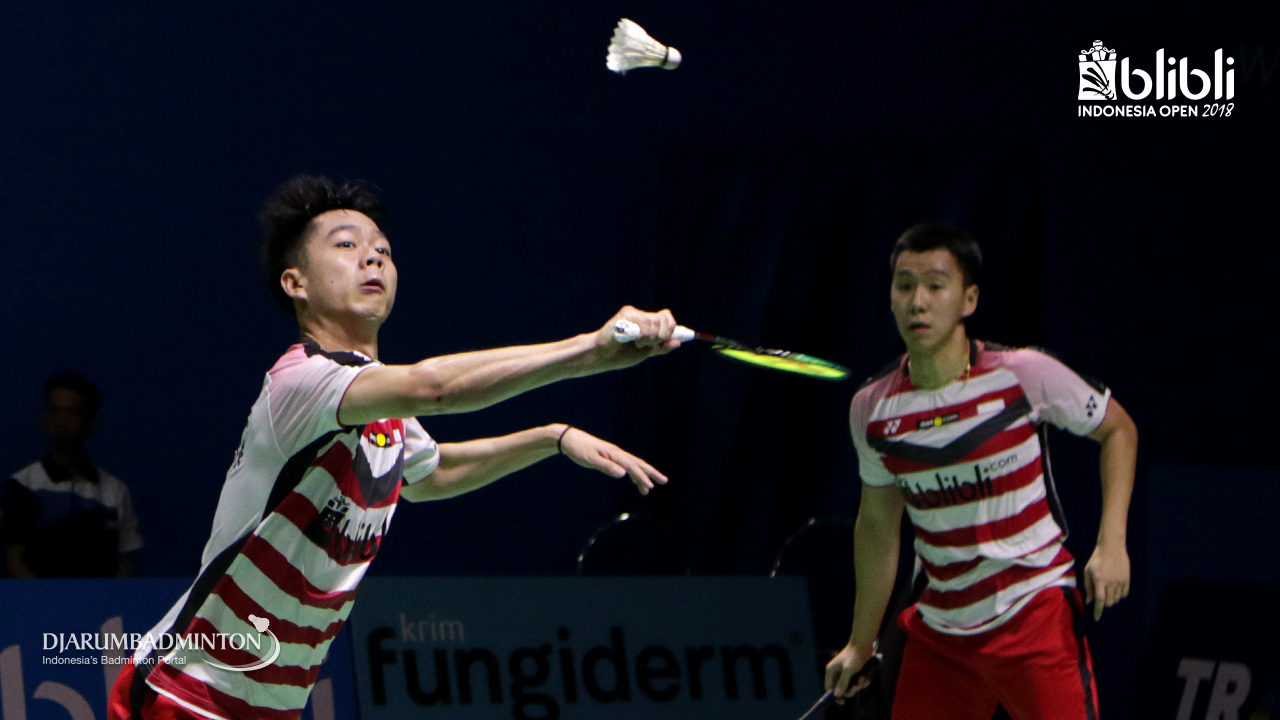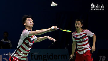 Marcus Fernaldi Gideon/Kevin Sanjaya Sukamuljo (INA) berusaha menggapai pengembalian
