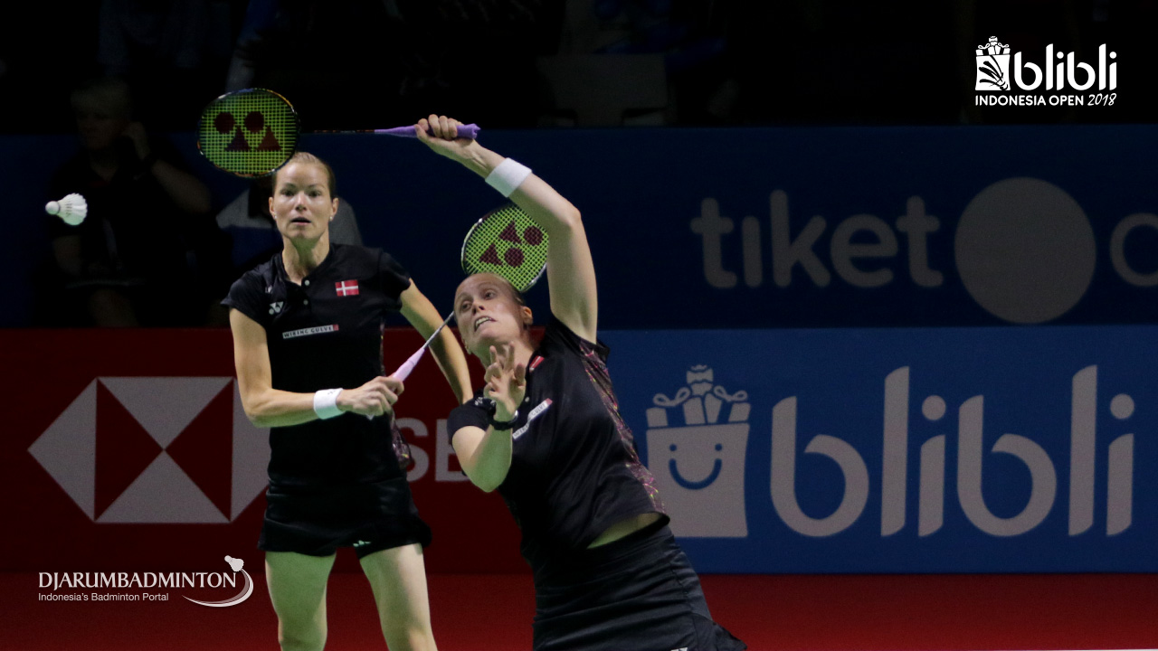 Kamilla Rytter Juhl/Christinna Pedersen (DEN) melepaskan serangan