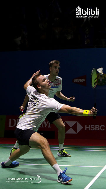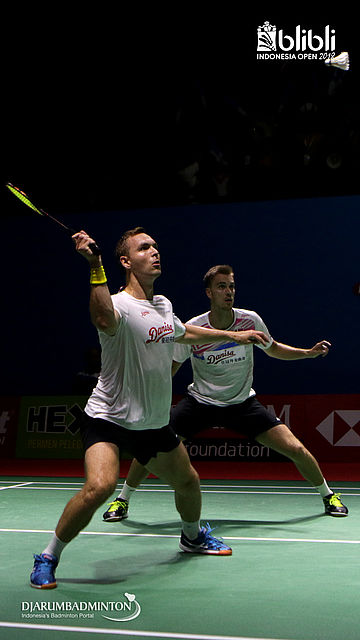 Mads Conrad-Petersen/Mads Pieler Kolding (DEN) mengembalikan shuttlecock.