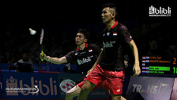 Fajar Alfian/Muhammad Rian Ardianto (INA) menghadang serangan.