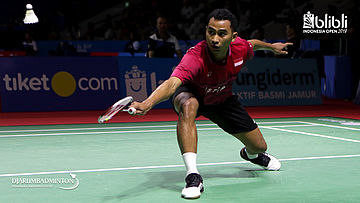Tommy Sugiarto (INA) mengembalikan shuttlecock.