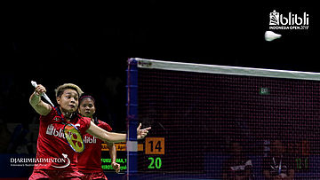 Greysia Polii/Apriyani Rahayu (INA) melepaskan serangan.