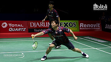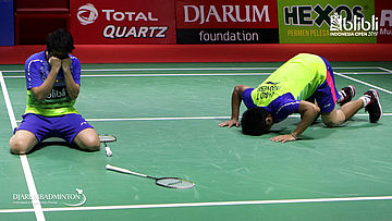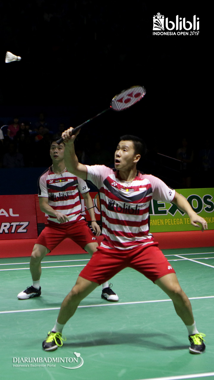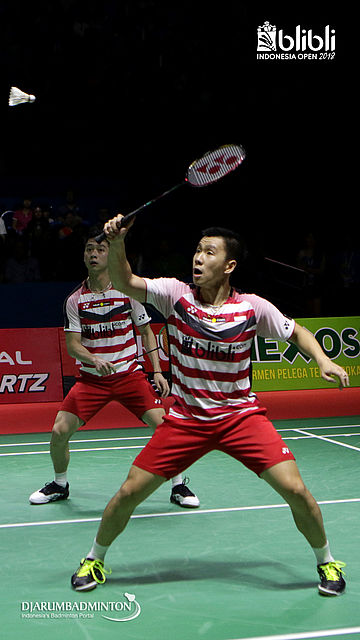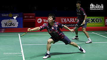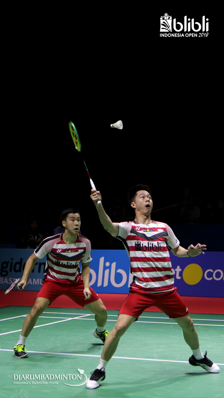 Marcus Fernaldi Gideon/Kevin Sanjaya Sukamuljo (INA) menyambut pengembalian