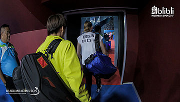 Evgeniya Kosetskaya (Russia) dan CHEN Yufei (Tiongkok) bersiap memasuki lapangan pertandingan