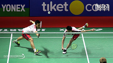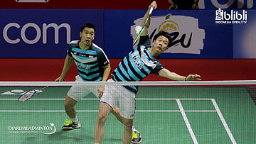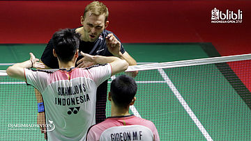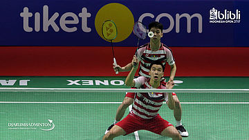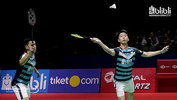 R16 - Marcus Fernaldi Gideon/Kevin Sanjaya Sukamuljo (INA) menyambar pengembalian tanggung