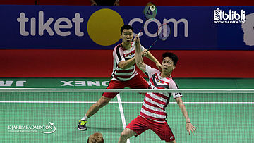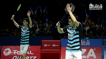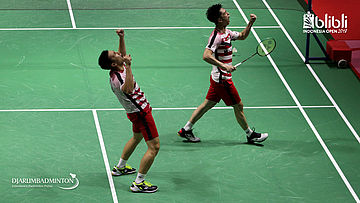 SF - Marcus Fernaldi Gideon/Kevin Sanjaya Sukamuljo (INA) menyambut pengembalian
