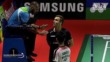 QF - Umpire saat memberikan peringatan kepada Kevin Sanjaya Sukamuljo (INA) dan Mads Conrad-Petersen (DEN)