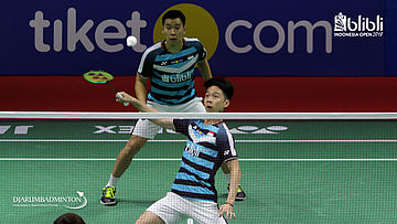 R16 - Marcus Fernaldi Gideon/Kevin Sanjaya Sukamuljo (INA) melepaskan serangan