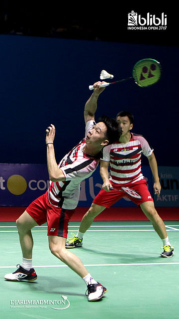 R32 - Marcus Fernaldi Gideon/Kevin Sanjaya Sukamuljo (INA) berusaha menggapai pengembalian