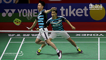 R32 - Marcus Fernaldi Gideon/Kevin Sanjaya Sukamuljo (INA) bersiap menyambut pengembalian
