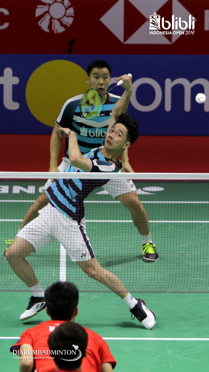 R16 - Marcus Fernaldi Gideon/Kevin Sanjaya Sukamuljo (INA) mengembalikan shuttlecock.