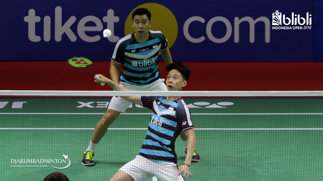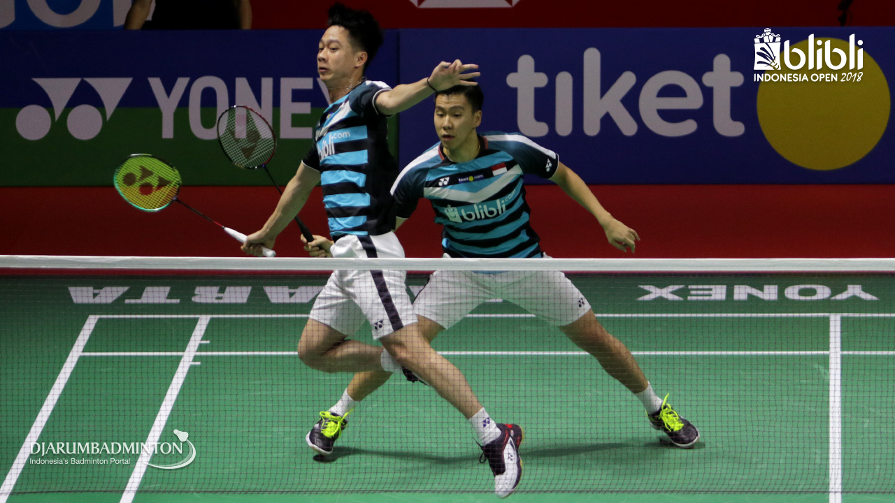 R32 - Marcus Fernaldi Gideon/Kevin Sanjaya Sukamuljo (INA) menghadang pengembalian