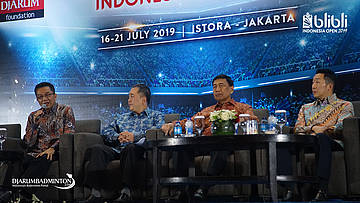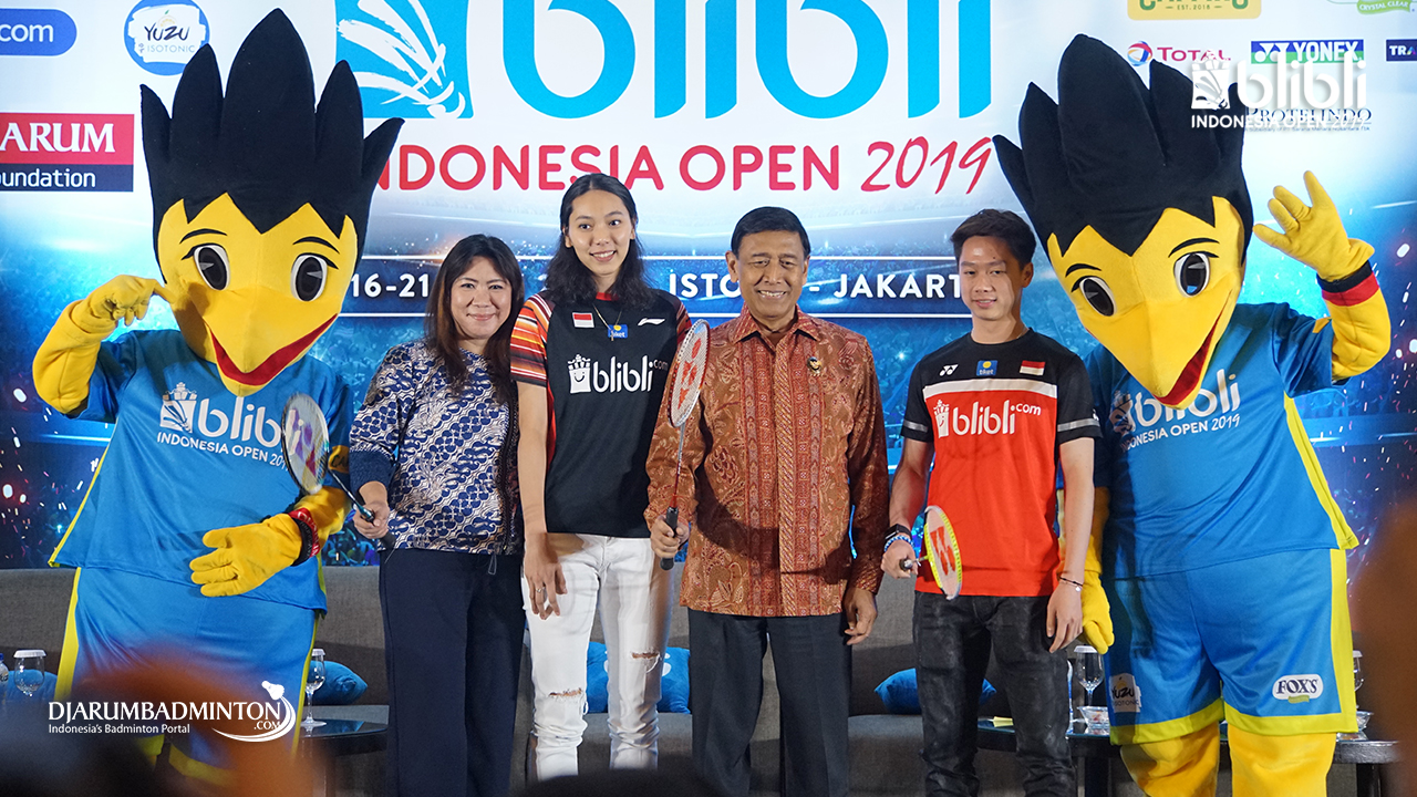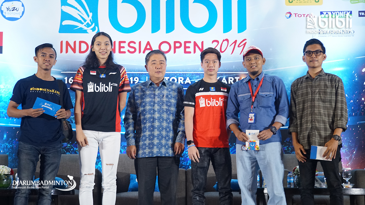 Gloria Emanuelle Widjaja, Kusumo Martanto, dan Kevin Sanjaya Sukamuljo Saat berada di Press Conference Blibli Indonesia Open 2019