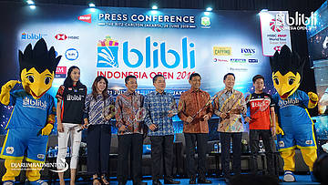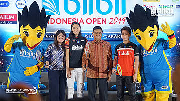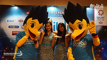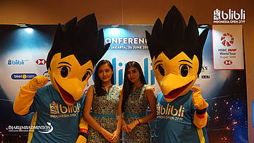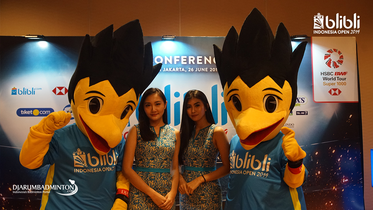 Dua Usher berpose bersama Maskot Blibli Indonesia Open 2019