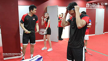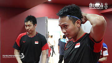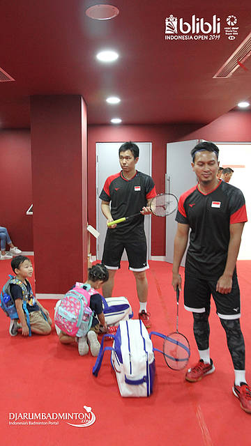 Hendra Setiawan dan M Ahsan melakukan persiapan di Players Services