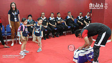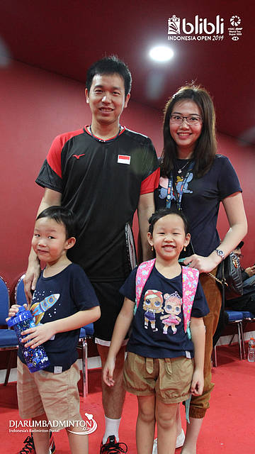 Anak dan istri Hendra Setiawan melihat persiapan M Ahsan di Players Services