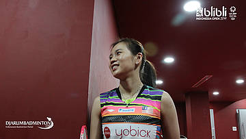 Goh Liu Ying (MAS) melakukan pemanasan di Players Services