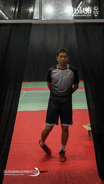 Marcus Fernaldi Gideon melakukan pemanasan di Warming Up Hall