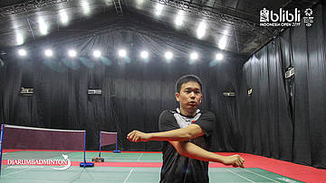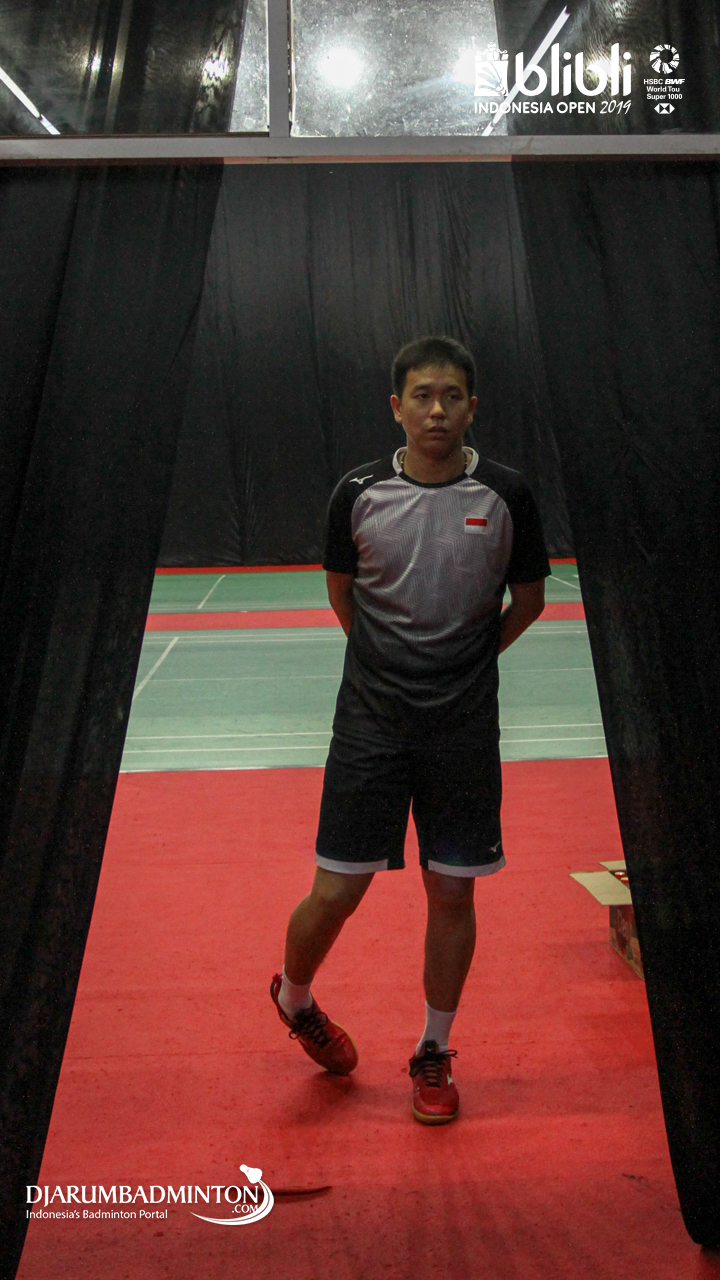 Hendra Setiawan melakukan pemanasan di Warming Up Hall