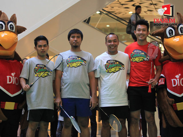 Ekspresi Denny Sumargo usai berhasil memasukan kok.