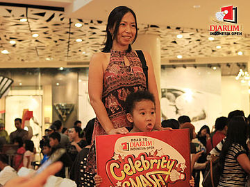 Seorang ibu dan anaknya sedang berpose di Photo Booth Djarum Indonesia Open Augmented Champion.