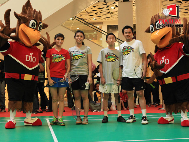 Foto Bersama para atlet bulutangkis, Gading Marten dan Denny Sumargo saat Celebrity Smash 2012 di Gandaria City, Jakarta, Sabtu (25/6).