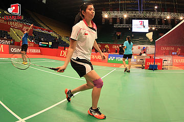 Beberapa pemain Indonesia, Ardriyanti Firdasari tengah melakukan uji coba lapangan di Istora Senayan Jakarta.