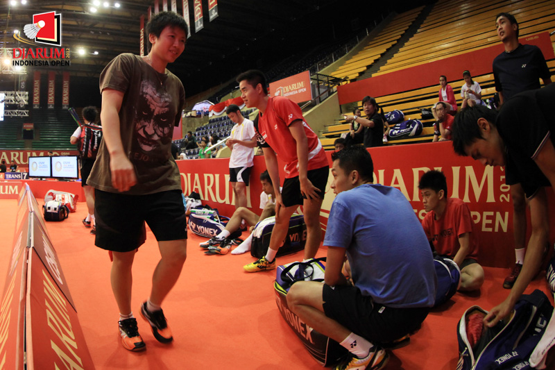 Beberapa pemain China tengah melakukan uji coba lapangan di Istora Senayan Jakarta.