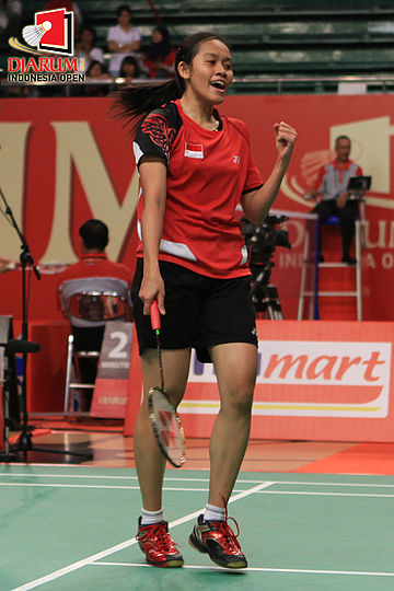 Ekspresi pemain Indonesia, Aprilla Yuswandari usai mengalahkan pemain asal Prancis, Sashina Vignes Waran di babak kualifikasi pertama Djarum Indonesia Open 2012.
