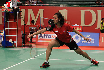 Pemain Indonesia, Aprilla Yuswandari berusaha mengembalikan kok ke arah pemain asal Prancis, Sashina Vignes Waran di babak kualifikasi pertama Djarum Indonesia Open 2012.