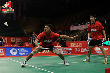 Pasangan Rangga Yave Rianto/Kusdianto Seiko Wahyu bersiap menerima kok dari pasangan asal Filipina, Philip Joper/Magnaye Peter di babak kualifikasi pertama Djarum Indonesia Open 2012.