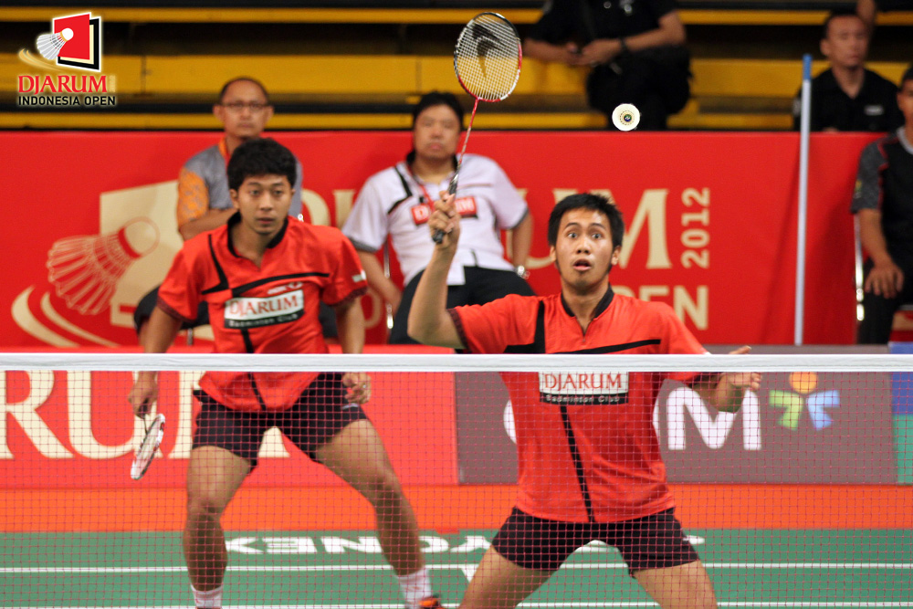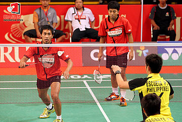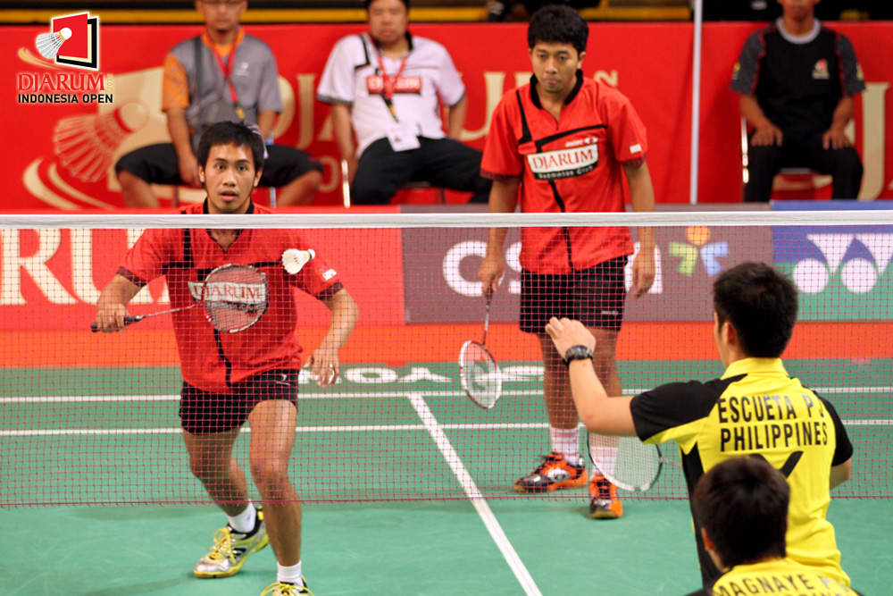 Pasangan Rangga Yave Rianto/Kusdianto Seiko Wahyu berusaha mengembalikan kok ke arah pasangan asal Filipina, Philip Joper/Magnaye Peter di babak kualifikasi pertama Djarum Indonesia Open 2012.