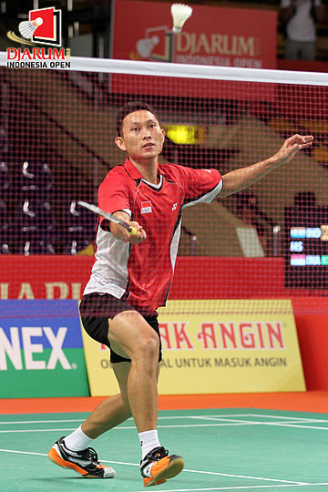Pemain Indonesia, Sony Dwi Kuncoro berusaha mengembalikan kok ke arah pemain India, Anand Pawar di babak kualifikasi pertama Djarum Indonesia Open 2012.