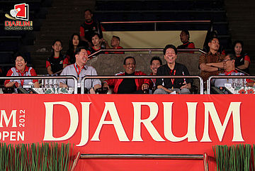 Usher yang bertugas di Djarum Indonesia Open 2012 memberikan semangat kepada pemain Indonesia.