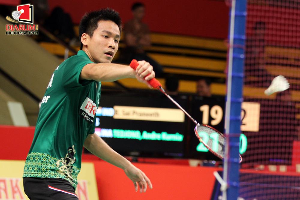 Ekspresi Andre Kurniawan Tedjono kala gagal melayangkan kok ke arah pemain asal India, Sai Praneeth di babak kualifikasi pertama Djarum Indonesia Open 2012.