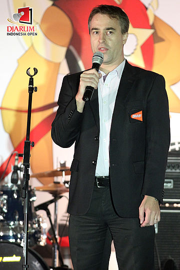 Perwakilan BWF tengah memberikan kata sambutan dalam Welcome Dinner Djarum Indonesia Open 2012 di Hotel Sultan, Jakarta.