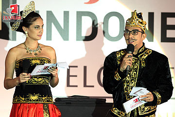 Stenny Agustaf (kanan) dan Marissa Nasution menjadi host dalam Welcome Dinner Djarum Indonesia Open 2012 di Hotel Sultan, Jakarta.