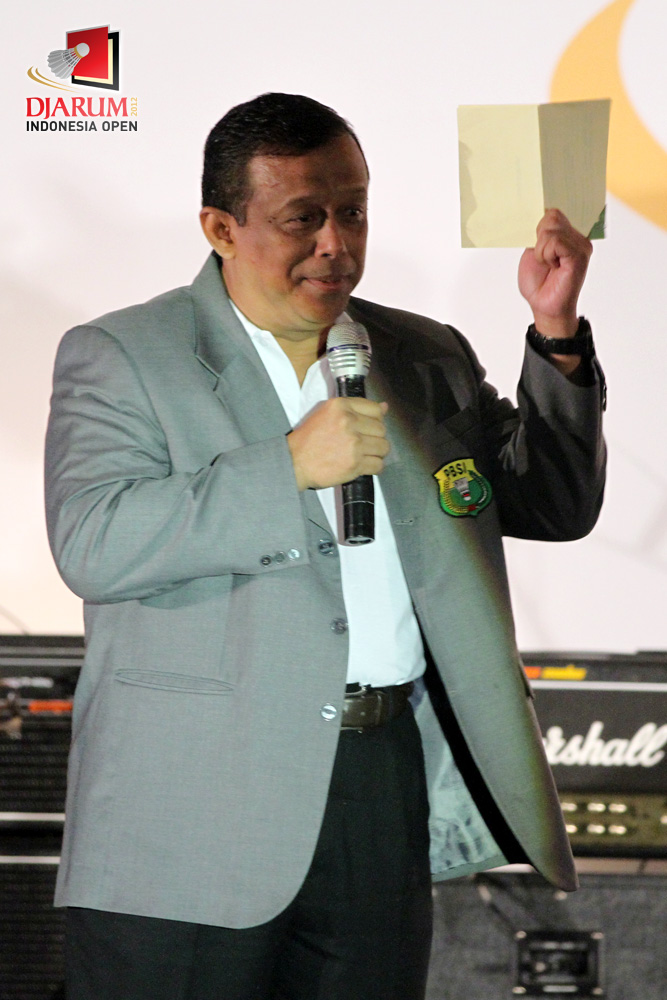 Ketua PB PBSI, Djoko Susanto tengah memberikan kata sambutan dalam Welcome Dinner Djarum Indonesia Open 2012 di Hotel Sultan, Jakarta.
