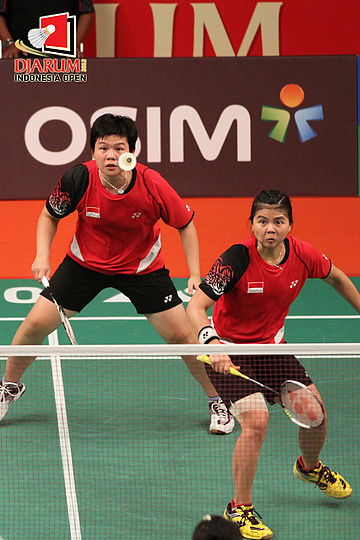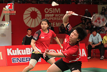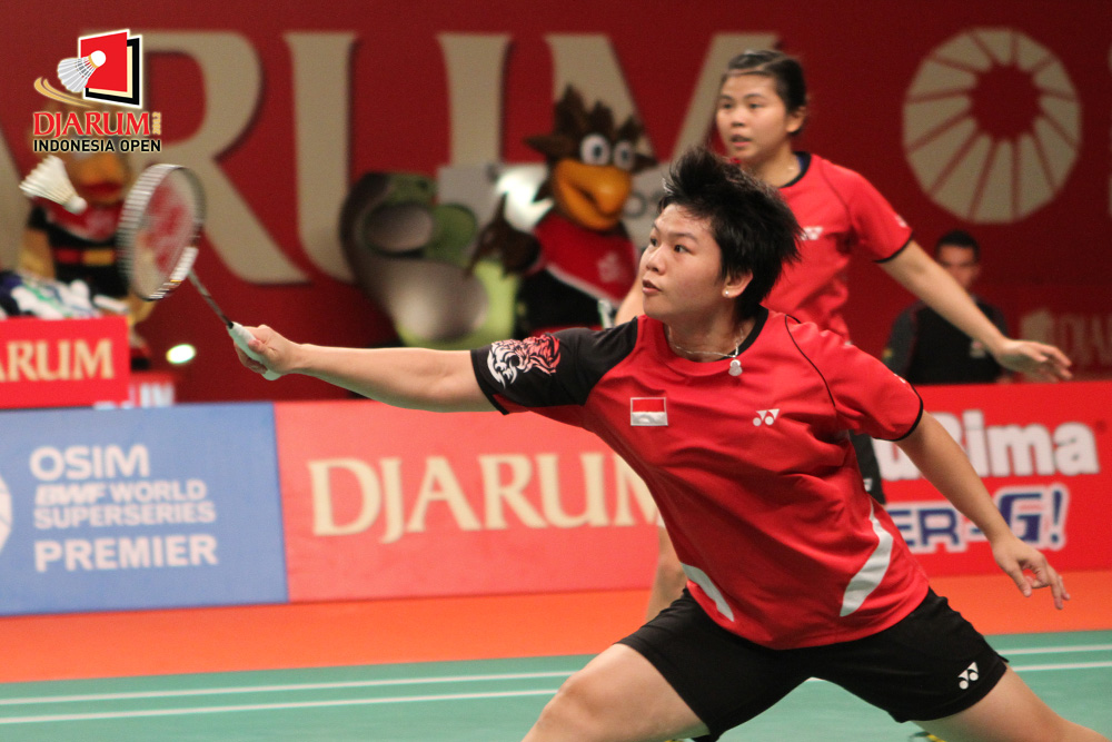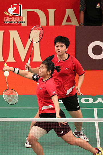 Pasangan Indonesia, Greysia Polii/Meiliana Jauhari berusaha mengembalikan kok ke arah pasangan asal China, Tian Qing/Zhao Yunlei.