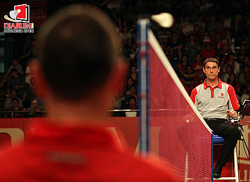 Wasit Wolf Gang Asal Perancis memimpin laga antara pasangan Indonesia, Hendra Setiawan/Markis Kido kontra pasangan Korea Selatan, Jae Sung/Lee Yong Dae.