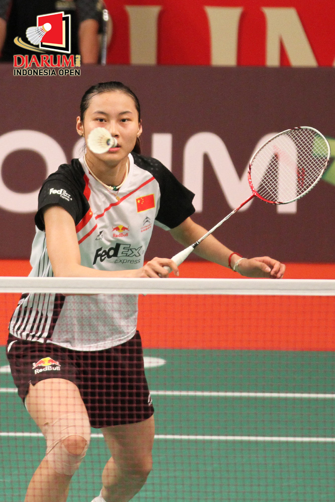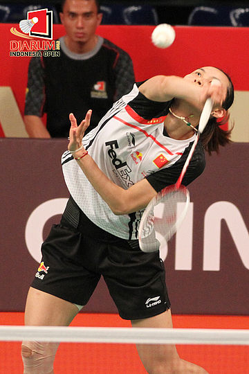 Pemain China, Wang Yihan berusaha mengembalikan kok ke arah rekan senegaranya, Li Xuerui.
