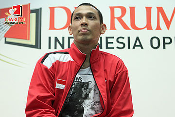 Pemain Indonesia,Bona Septano ketika tengah melakukan meet and greet dengan pengunjung yang menyaksikan laga semifinal Djarum Indonesia Open 2012.