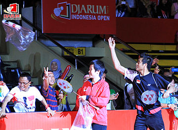 Pasangan Indonesia, Tontowi Ahmad membagikan hadiap kepada pengunjung sebelum melakoni laga final Djarum Indonesia Open 2012.