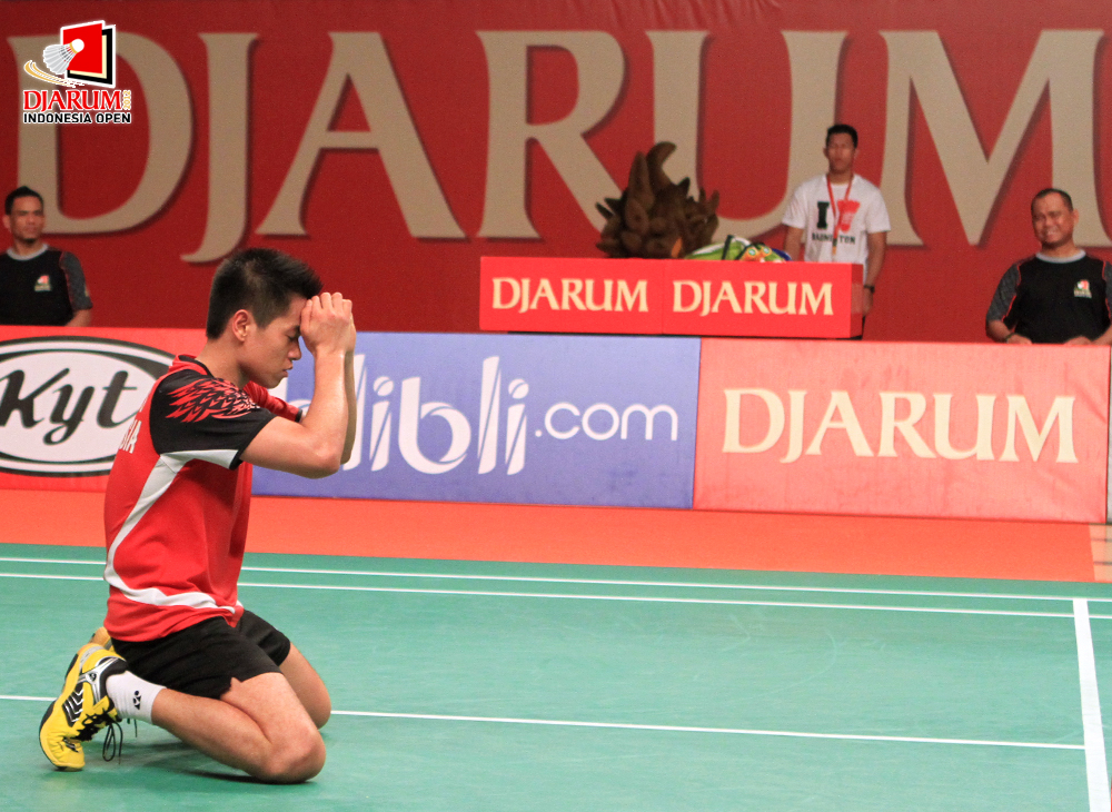 Ekspresi pemain Indonesia, Simon Santoso menang atas pemain China, Du Pengyu.